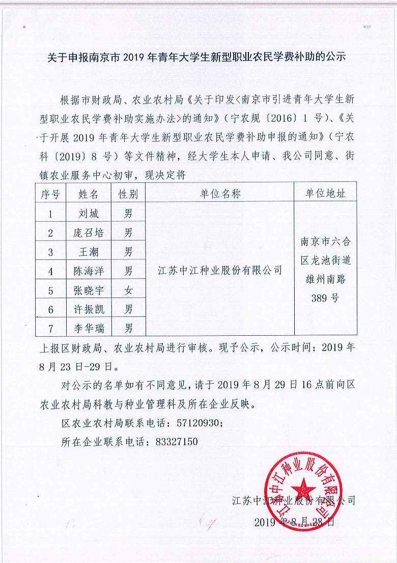 根據(jù)市財政局、農(nóng)業(yè)農(nóng)村局《關(guān)于印發(fā)<南京市引進青年大學生新型職業(yè)農(nóng)民學費補助實施辦法>的通知》(寧農(nóng)規(guī)〔2016〕1號)、《關(guān)于開展2019年青年大學生新型職業(yè)農(nóng)民學費補助申報的通知》(寧農(nóng)科〔2019〕8號)等文件精神,經(jīng)大學生本人申請、我公司同意、街鎮(zhèn)農(nóng)業(yè)服務中心初審,現(xiàn)決定將擬享受補助政策青年大學生名單上報區(qū)財政局、農(nóng)業(yè)農(nóng)村局進行審核。現(xiàn)予公示,公示時間:2019年8月23日-29日。