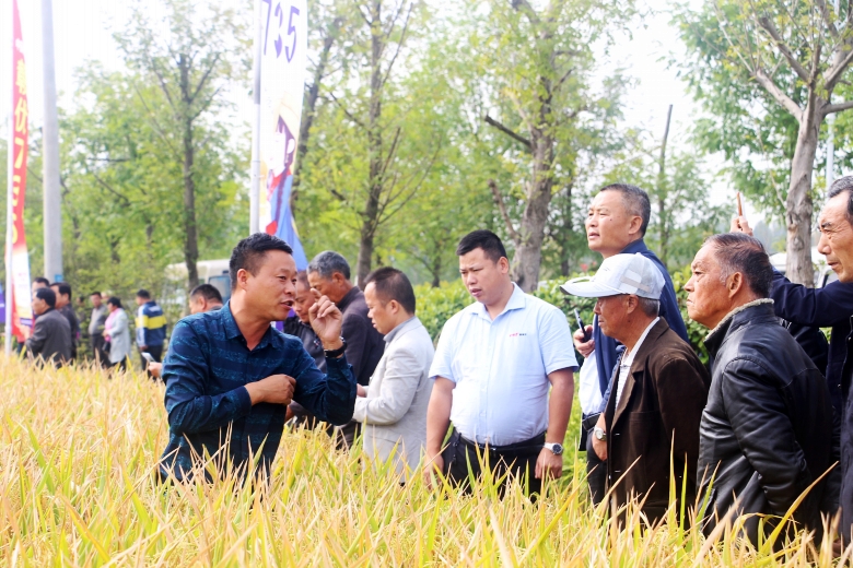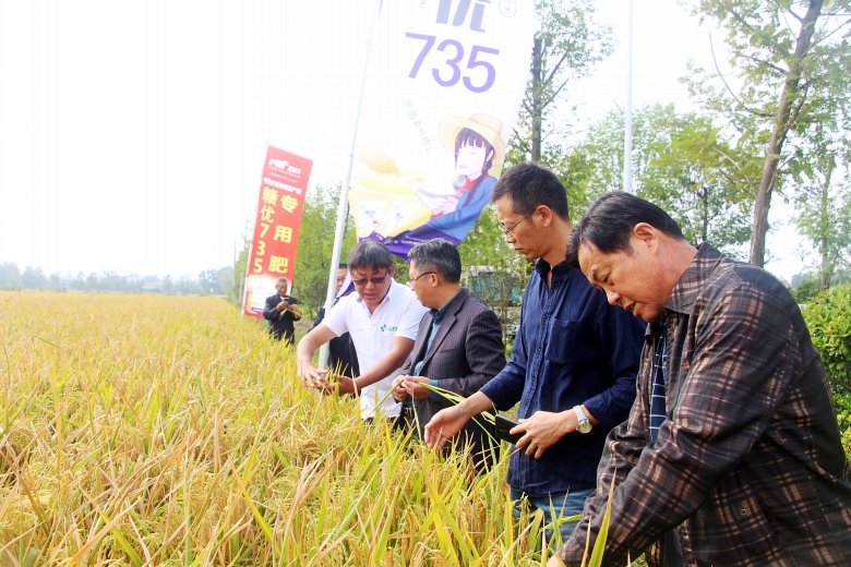 金秋十月,祖國華誕,崢嶸70載,與國同夢。2019年10月13日,來自江蘇,安徽區(qū)域的縣、鄉(xiāng)鎮(zhèn)經(jīng)銷商及種植大戶150余人,來到沭陽縣錢集鎮(zhèn)觀摩“贛優(yōu)735+專用肥”示范田。一下大巴車,映入眼簾的是80余畝“贛優(yōu)735+專用肥”示范田,一片黃燦燦的喜人景色。走到田間,大家紛紛夸獎品種表現(xiàn)不錯,個子矮,穗子大,粒子多,結(jié)實率高。大家對“贛優(yōu)735+專用肥”種植的田間表現(xiàn)非常滿意,良種良法,科學(xué)管理,紛紛表示明年一定要推廣。“災(zāi)年不減產(chǎn),豐年更高產(chǎn)”,這是已推廣該品種的經(jīng)銷商們最好的評價。
