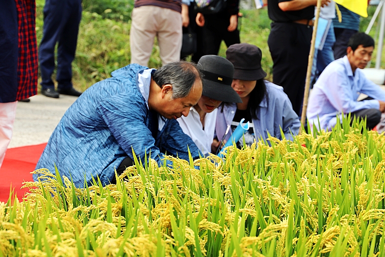 參會代表現(xiàn)場觀摩了白馬湖農(nóng)場170畝“佳源粳1號”綠色高質(zhì)高效生產(chǎn)示范方和“江蘇好品種”展示田的“佳源粳1號”,即將收獲的“佳源粳1號” 穗型大,稈青籽黃粒飽,呈現(xiàn)一派豐收景象。參加觀摩的領(lǐng)導(dǎo)、專家和代表對“佳源粳1號”交口稱贊,蔡廳長深入田間查看長勢情況。示范方理論測產(chǎn)809.6公斤。