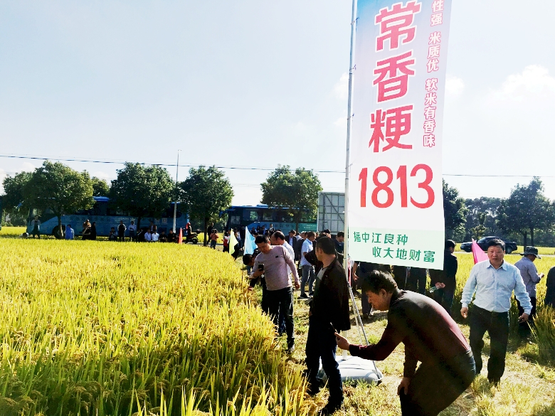 10月11日在江南福地常熟,我公司和常熟市農(nóng)業(yè)科學(xué)研究所聯(lián)合召開常香粳1813現(xiàn)場(chǎng)觀摩會(huì)。常香粳1813是常熟市農(nóng)科所最新育成并通過審定的早熟晚粳水稻品種,集米質(zhì)優(yōu)、熟期適中、抗倒性強(qiáng)、中抗稻瘟病、稻米有香味等諸多優(yōu)點(diǎn)于一身,適宜在江蘇省沿江及蘇南地區(qū)種植。