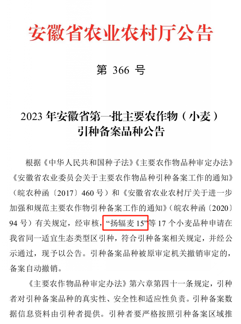 熱烈祝賀我公司選育的高產(chǎn)、高抗小麥“揚(yáng)輻麥15”通過(guò)安徽省引種備案!
