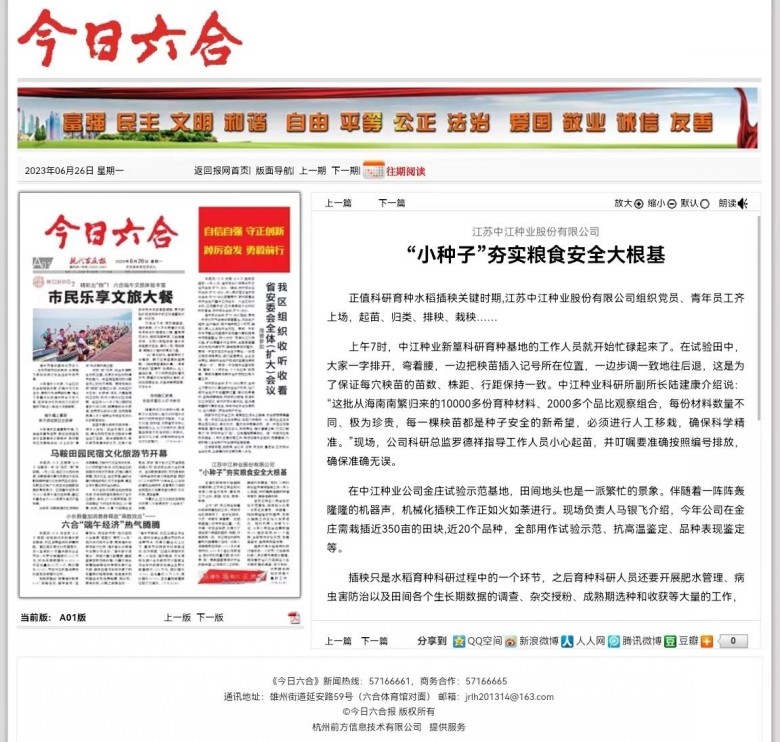 轉(zhuǎn)自今日六合:江蘇中江種業(yè)股份有限公司“小種子”夯實糧食安全大根基
