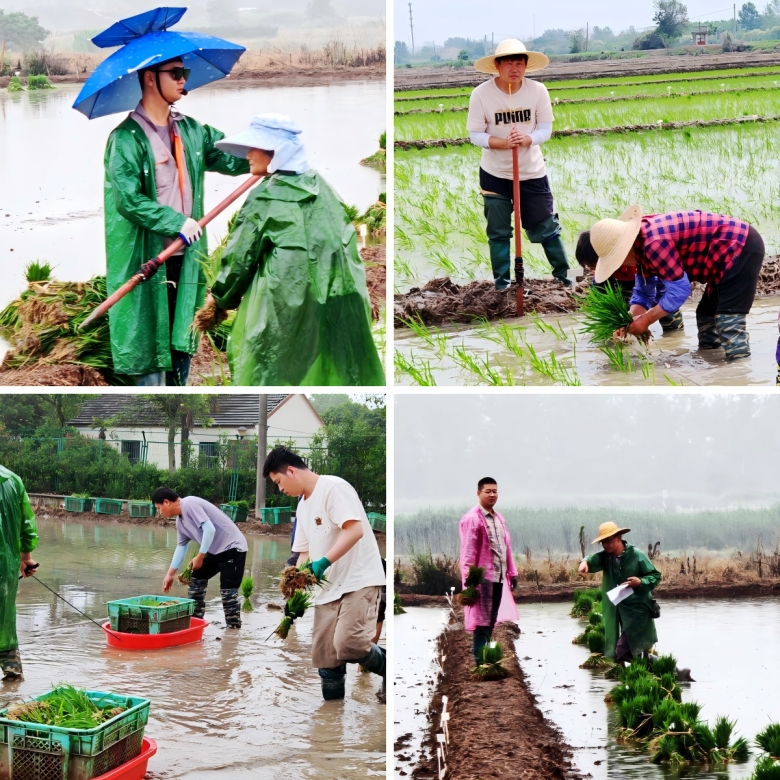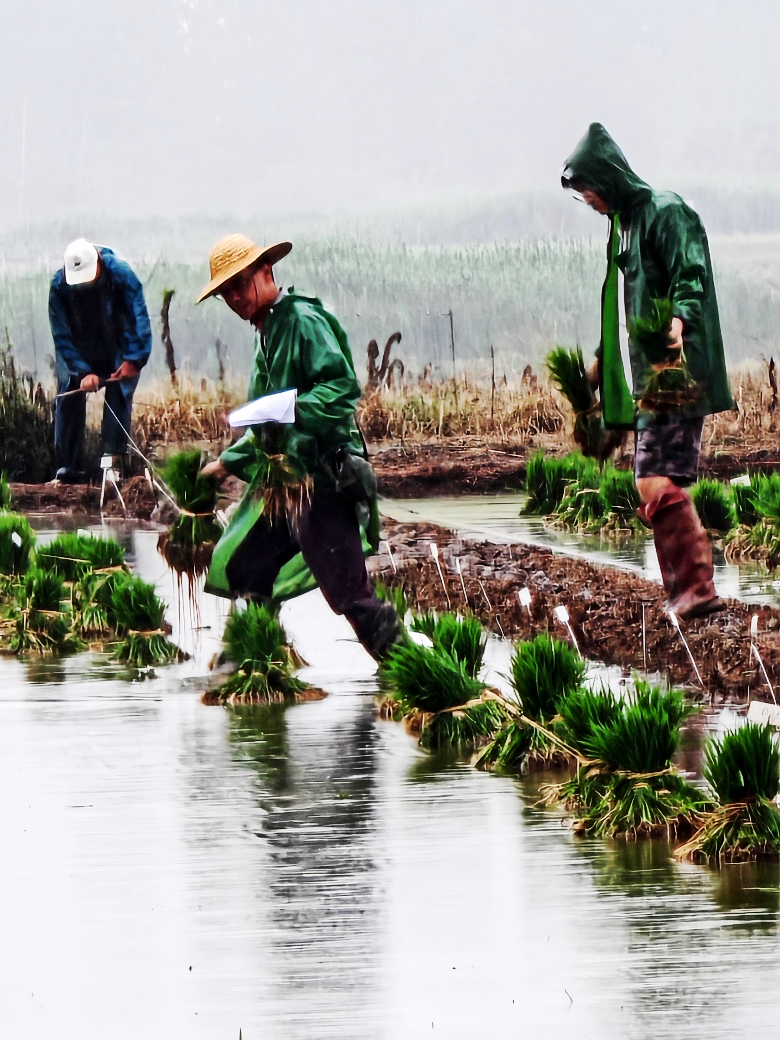 隨后,陸建康有條不紊地進行明確分工,眾人聽罷,立刻“武裝”上陣——草帽、雨衣遮雨,套袖護臂,穿上雨鞋踏入泥濘。一場精細協(xié)作的“接力賽”在風雨中展開,拔秧人員嚴格遵循指導,輕拔、洗凈、捆扎、歸位,每一個動作都精準到位;運秧人員小心翼翼地將捆好的秧苗按標記,精準地移入運秧框,送往水田;擺秧人員依據(jù)預設的品種布局點,將不同秧苗準確無誤地“對號入座”,擺放在指定的水田格位;插秧人員將定位好的秧苗,一根根精準插入田中;補秧人員則查漏補缺,確保每一寸試驗田都秧苗到位。拔苗區(qū)、運輸線、擺秧點、插秧位、補漏組……各環(huán)節(jié)瞬間聯(lián)動。風雨中的田埂上,一條為育種科研量身定制的高精度“流水線”高效運轉起來,每一道工序都寫滿對種子的敬畏和對數(shù)據(jù)的嚴謹。