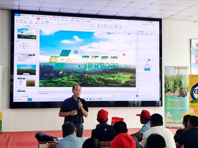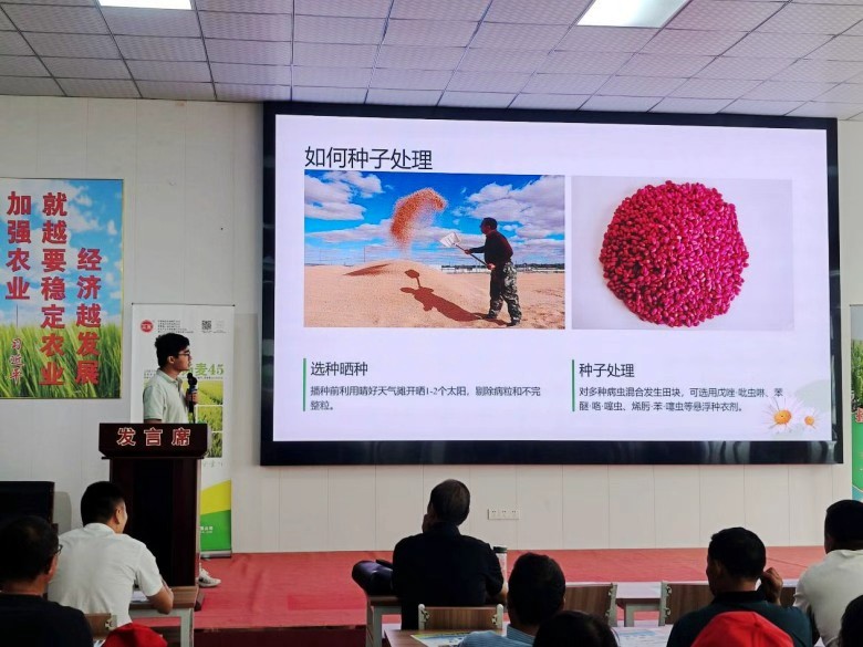中江種業(yè)蘇中區(qū)域市場(chǎng)銷售負(fù)責(zé)人吳偉在簡(jiǎn)要介紹公司的發(fā)展歷程后,重點(diǎn)就“揚(yáng)麥45”的品種特性、產(chǎn)量表現(xiàn)、栽培技術(shù)及近兩年該品種在多地的大面積示范與推廣成效作了詳細(xì)分享。特別提到,2025年在南通市如東縣吳寶權(quán)家庭農(nóng)場(chǎng),“揚(yáng)麥45”實(shí)現(xiàn)實(shí)收單產(chǎn)1380斤,表現(xiàn)出優(yōu)異的產(chǎn)量潛力。