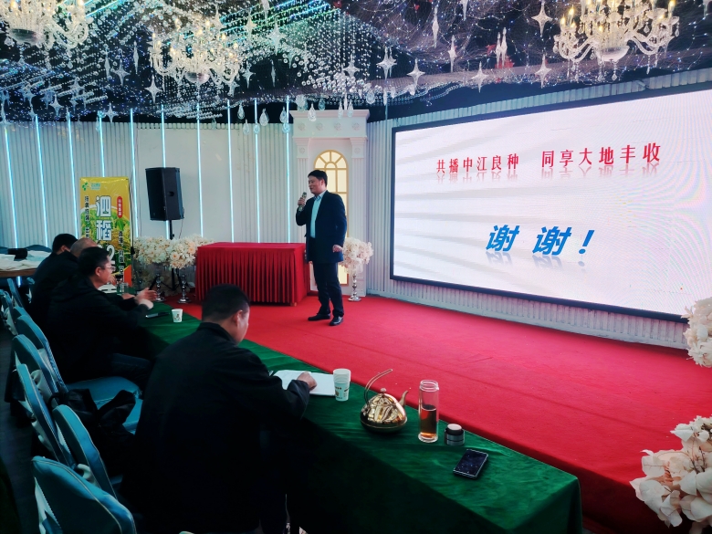 隨后的室內(nèi)會議由宿遷中江種業(yè)市場部經(jīng)理侍超主持。江蘇省農(nóng)業(yè)科學(xué)院宿遷農(nóng)科所水稻室主任陳春應(yīng)邀出席,系統(tǒng)介紹了“輕簡豐產(chǎn)型品種泗稻22號”與“優(yōu)質(zhì)食味型品種泗稻301”的選育背景及特征特性,參會經(jīng)銷商對兩個(gè)品種的核心優(yōu)勢有了更深入的理解。